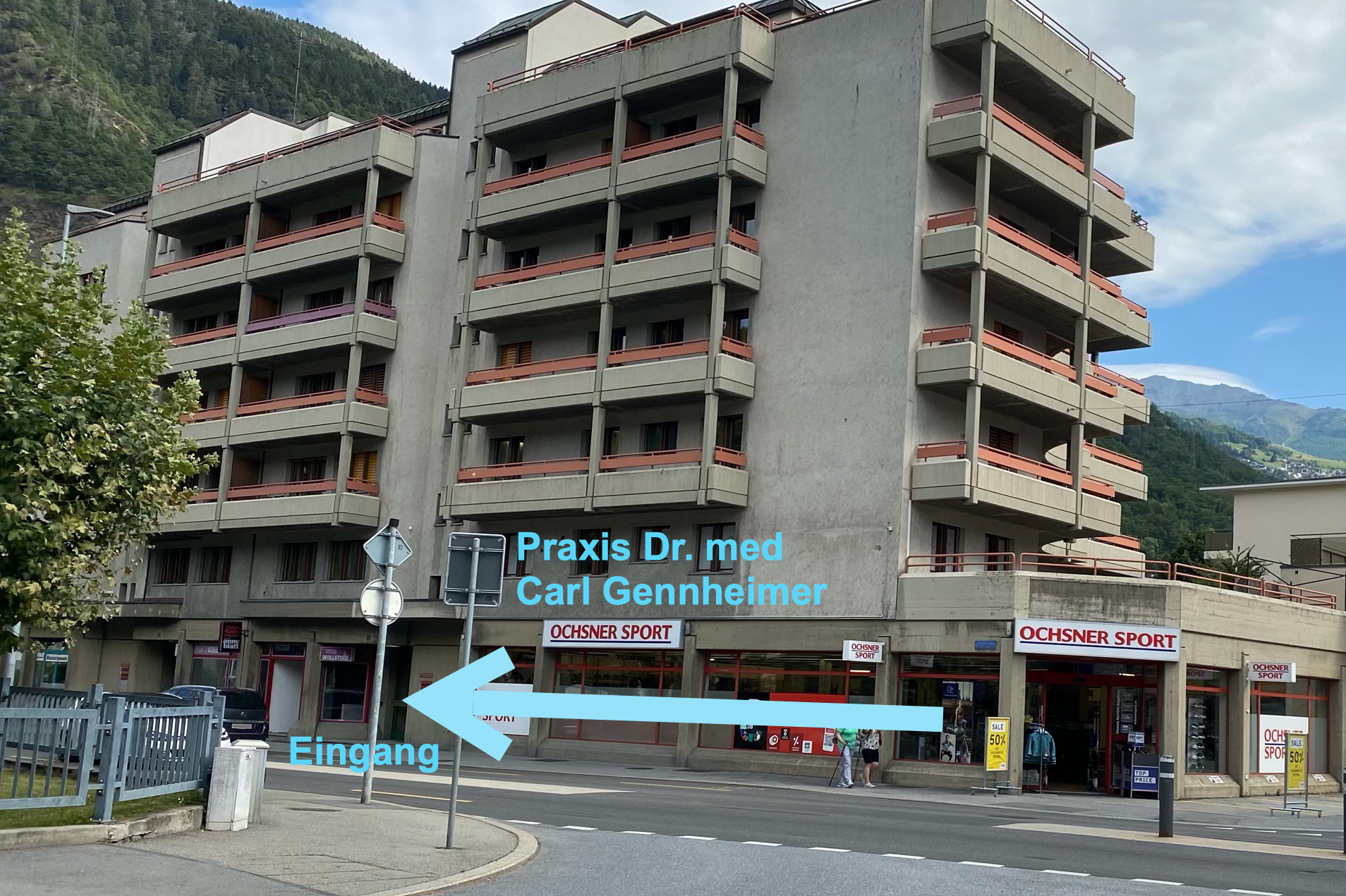 Unsere Praxis befindet sich im Zentrum von Visp, an der Kantonsstrasse 14, im 1. Stock über der Ochsner Sport Filiale.